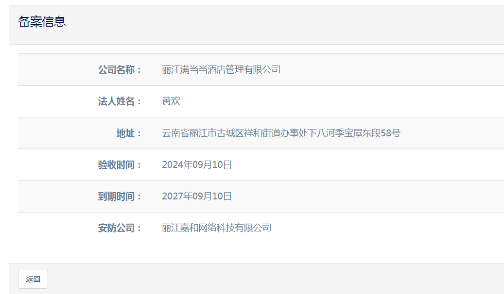 關于麗江滿當當酒店管理有限公司電子監控安防合格證下證通知
