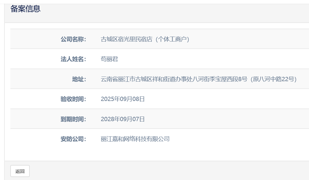 關于古城區宿光里民宿店(個體工商戶)電子監控安防合格證下證通知
