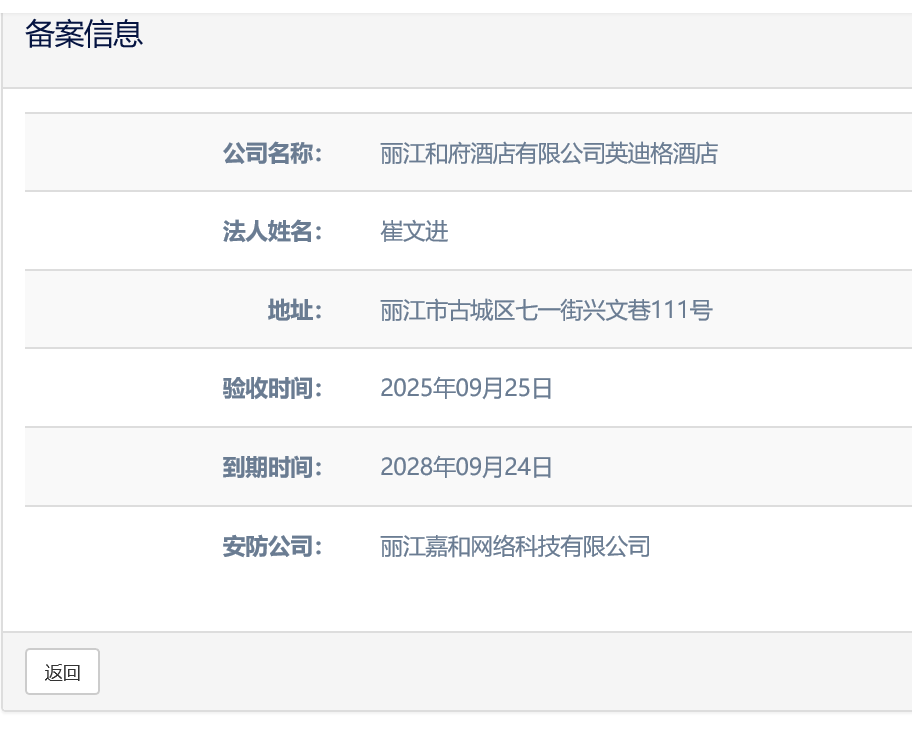 關于麗江和府酒店有限公司英迪格酒店電子監控安防合格證下證通知
